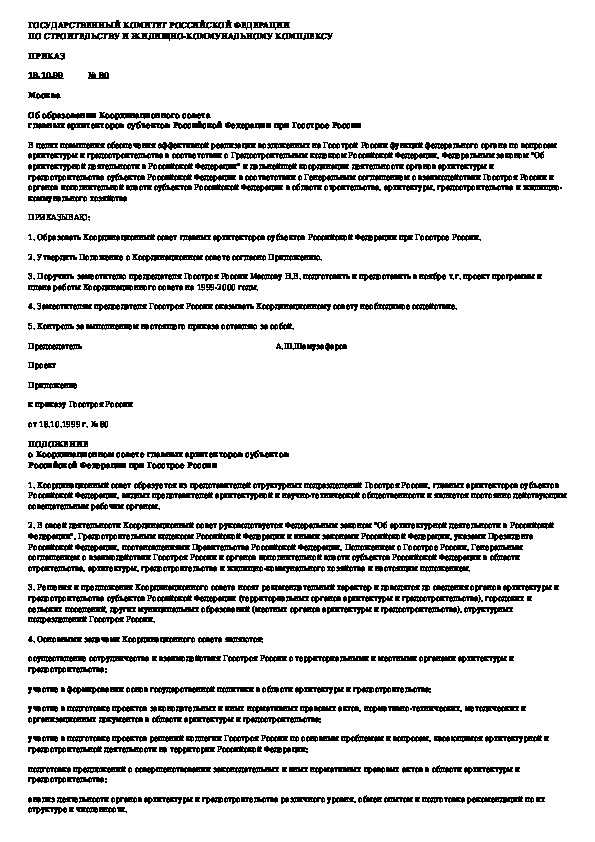 Приказ 80: Об образовании Координационного совета главных архитекторов субъектов Российской Федерации при Госстрое России