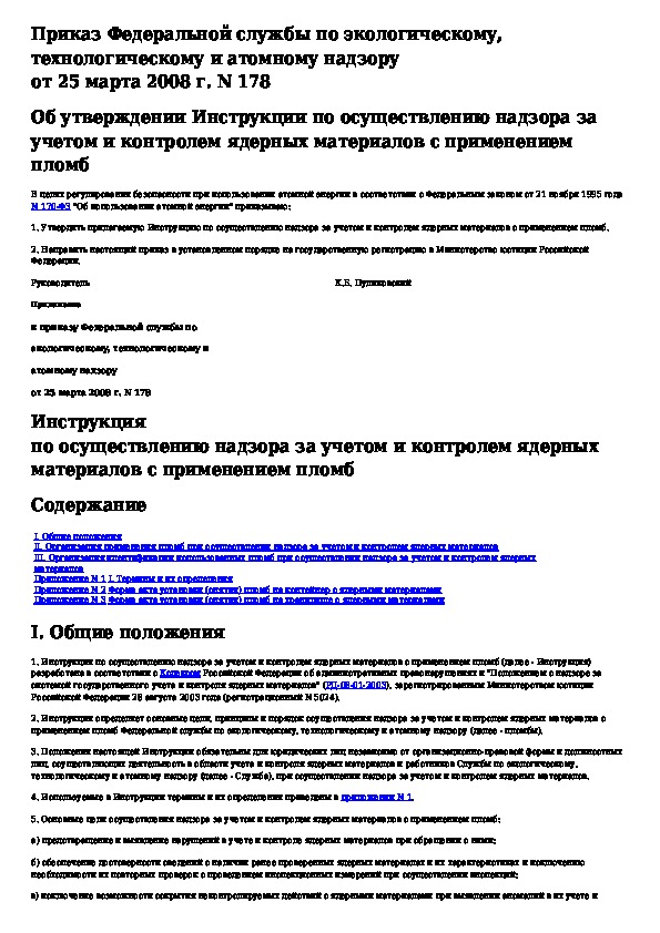 Приказ 178: Инструкция по осуществлению надзора за учетом и контролем ядерных материалов с применением пломб