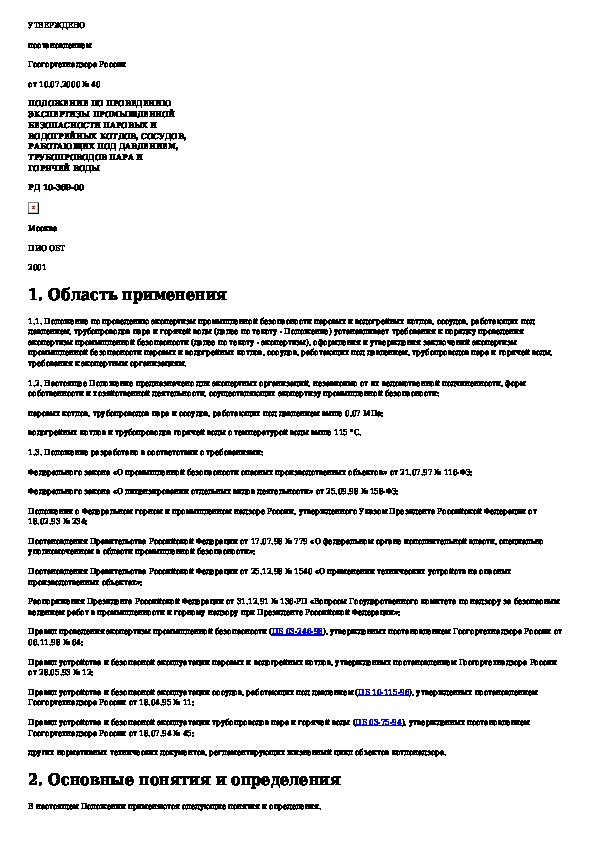 РД 10-369-00: Положение по проведению экспертизы промышленной безопасности паровых и водогрейных котлов, сосудов, работающих под давлением, тр
