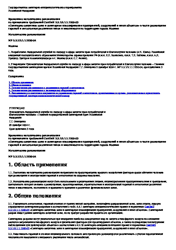 МР 2.2.1/2.1.1.1936-04: Временные методические рекомендации по применению требований СанПиН 2.2.1/2.1.1.1200-03 "Санитарно-защитные зоны и санитарная классифика
