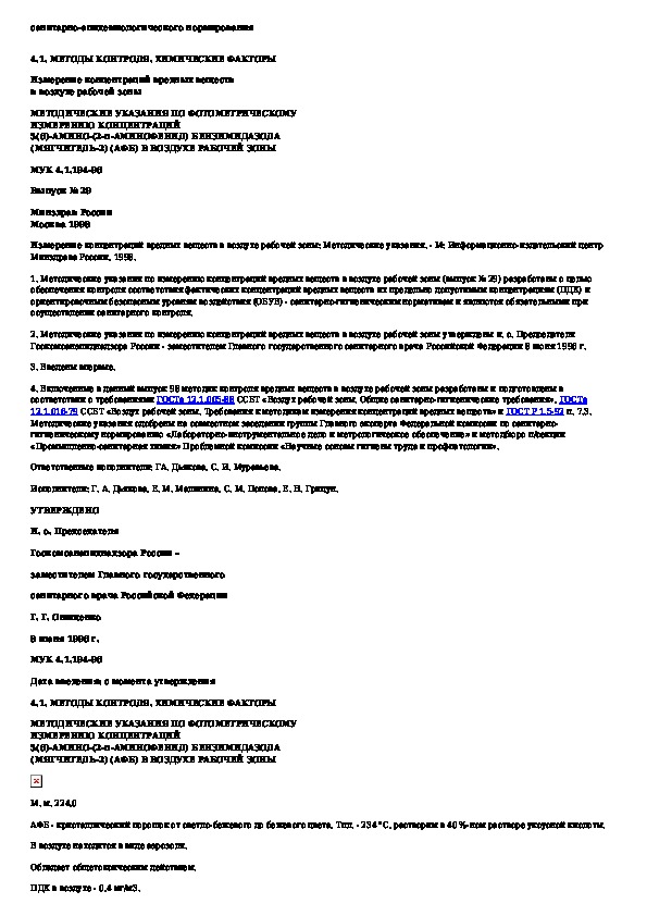 • Просмотр в полноэкранном режиме - легко просмотреть документ Методические указания по фотометрическому измерению концентраций 5(6)-амино-(2-п-аминофенил) бензимидазола (мягчитель-2) (АФБ) в возду (без загрузки его на свой компьютер).