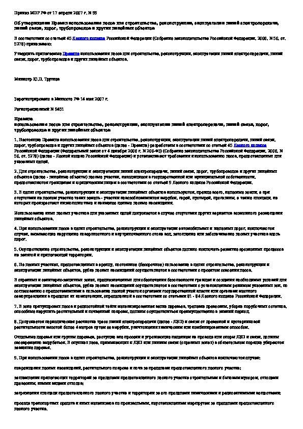 Приказ 99: Правила использования лесов для строительства, реконструкции, эксплуатации линий электропередачи, линий связи, дорог, трубопрово