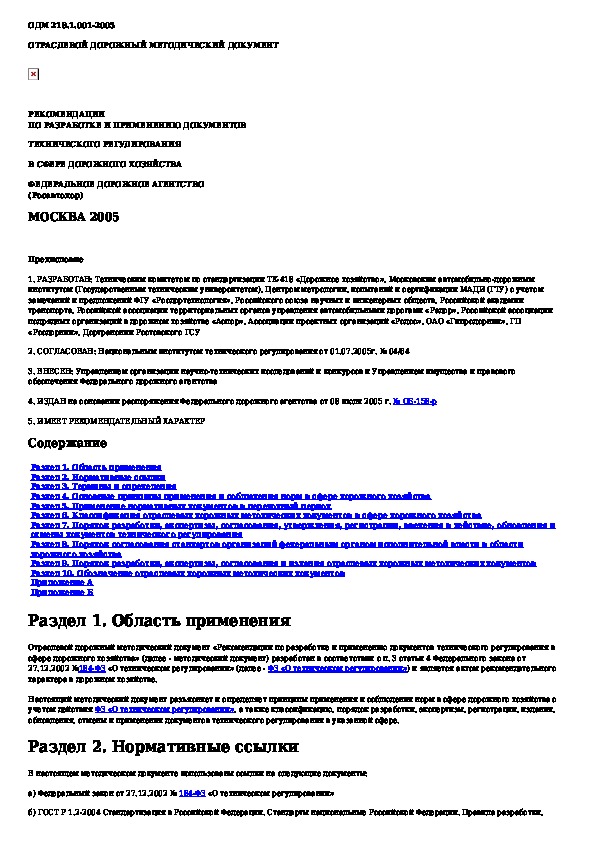 ОДМ 218.1.001-2005: Рекомендации по разработке и применению документов технического регулирования в сфере дорожного хозяйства