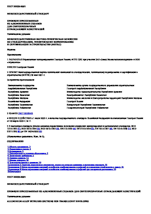 ГОСТ 22233-2001*: Профили прессованные из алюминиевых сплавов для светопрозрачных ограждающих конструкций. Технические условия