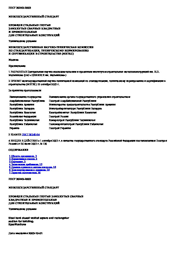 ГОСТ 30245-2003: Профили стальные гнутые замкнутые сварные квадратные и прямоугольные для строительных конструкций. Технические условия