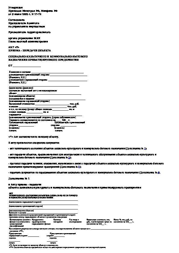 Приказ 17-72: Об утверждении технической документации и актов приема-передачи объектов социально-культурного и коммунально-бытового назначени