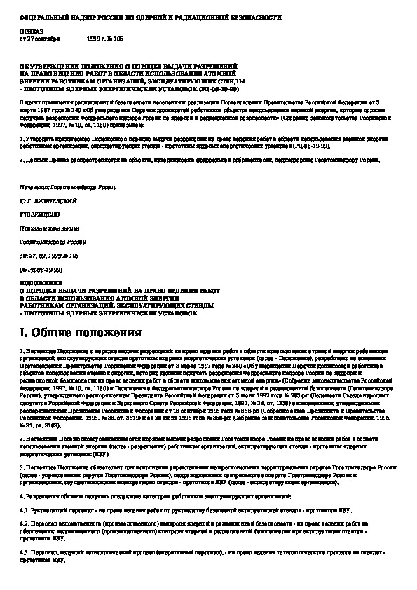 РД 06-19-99: Положение о порядке выдачи разрешений на право ведения работ в области использования атомной энергии работникам организаций, экс