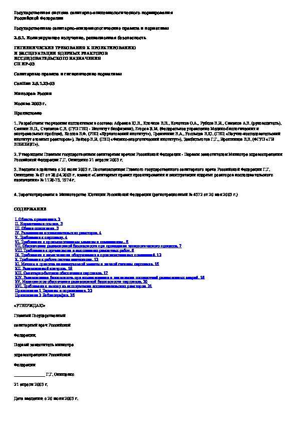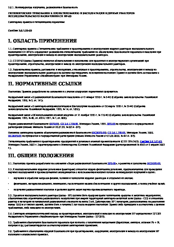 СанПиН 2.6.1.23-03: Гигиенические требования к проектированию и эксплуатации ядерных реакторов исследовательского назначения СП ИР-03