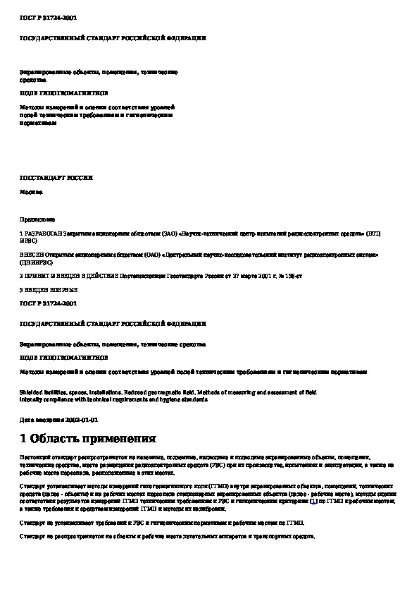 ГОСТ Р 51724-2001: Экранированные объекты, помещения, технические средства. Поле гипогеомагнитное. Методы измерений и оценки соответствия уровней п