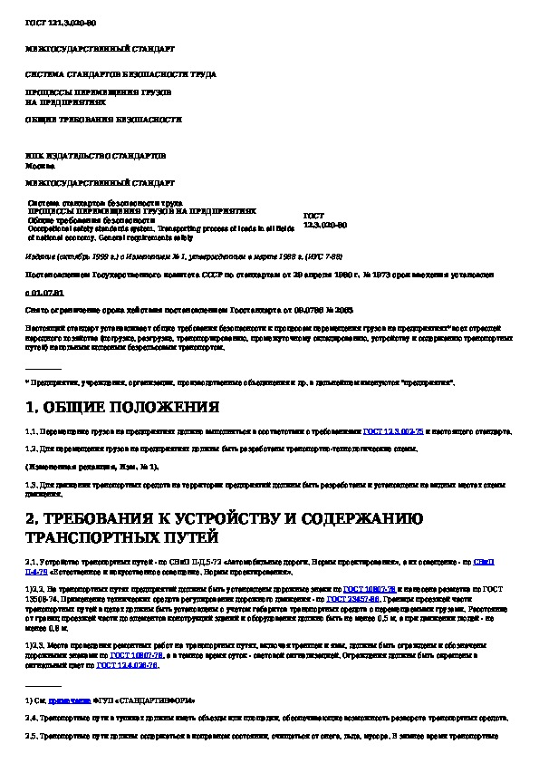 ГОСТ 12.3.020-80: Система стандартов безопасности труда. Процессы перемещения грузов на предприятиях. Общие требования безопасности