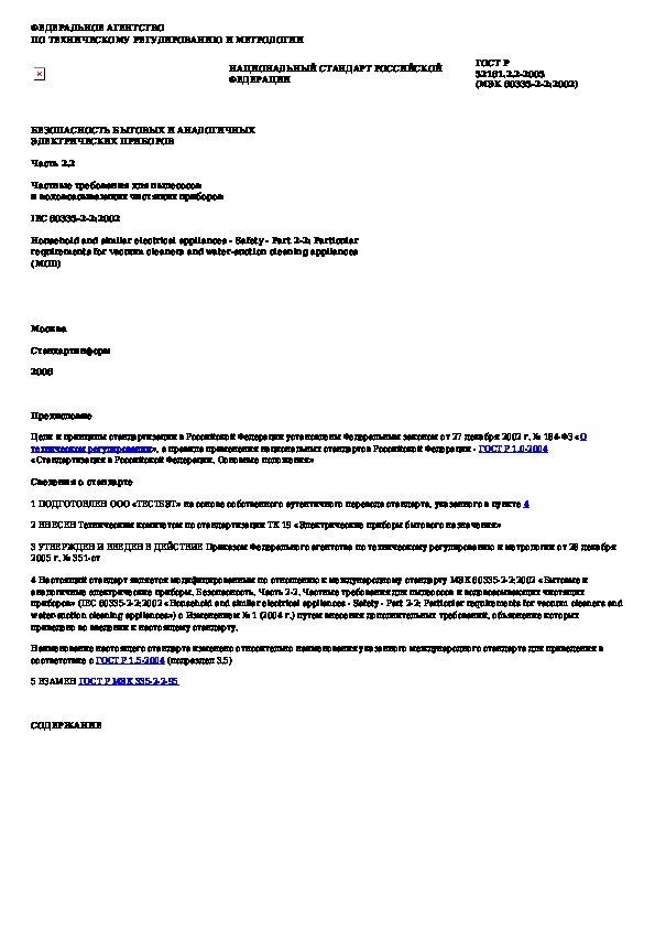 ГОСТ Р 52161.2.2-2005: Безопасность бытовых и аналогичных электрических приборов. Часть 2.2. Частные требования для пылесосов и водовсасывающих чистящих