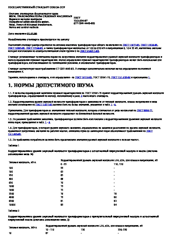 Система стандартов безопасности труда. Шум. Трансформаторы силовые масляные. Нормы и методы контроля