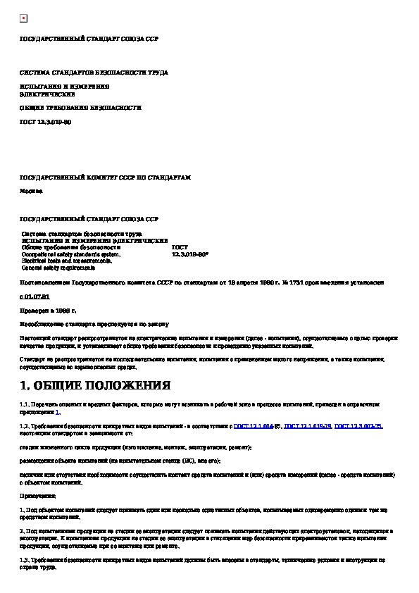 ГОСТ 12.3.019-80: Система стандартов безопасности труда. Испытания и измерения электрические. Общие требования безопасности