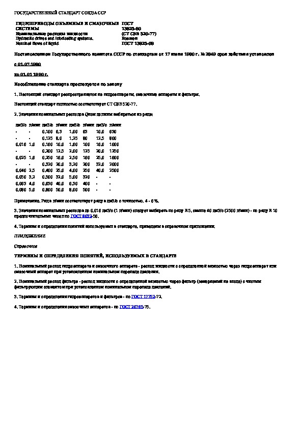 ГОСТ 13825-80: Гидроприводы объемные и смазочные системы. Номинальные расходы жидкости