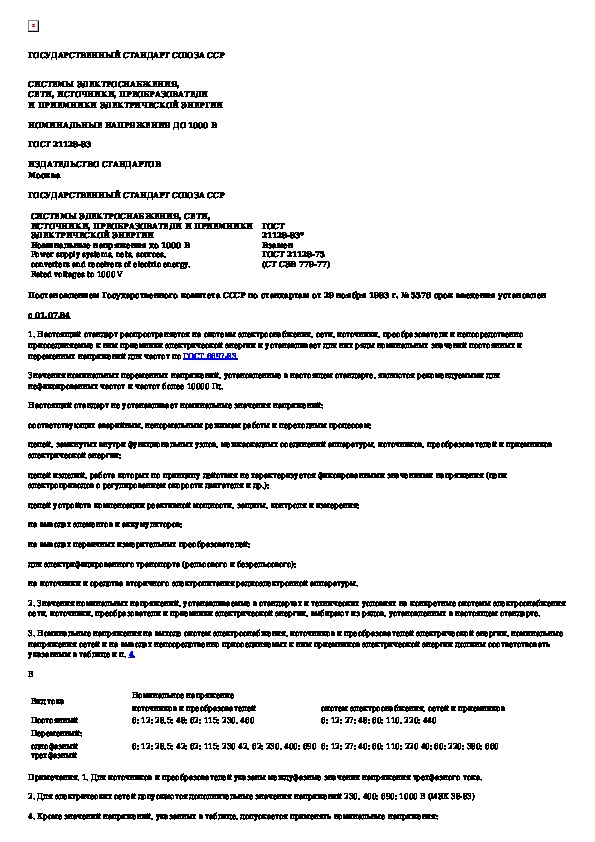 ГОСТ 21128-83: Системы электроснабжения, сети, источники, преобразователи и приемники электрической энергии. Номинальные напряжения до 1000 В