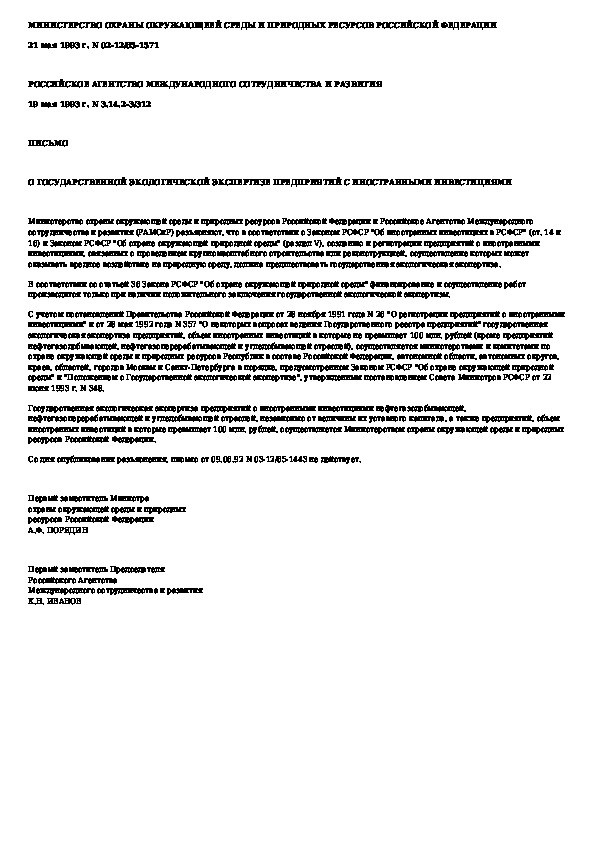 Письмо 02-12/65-1571: О государственной экологической экспертизе предприятий с иностранными инвестициями