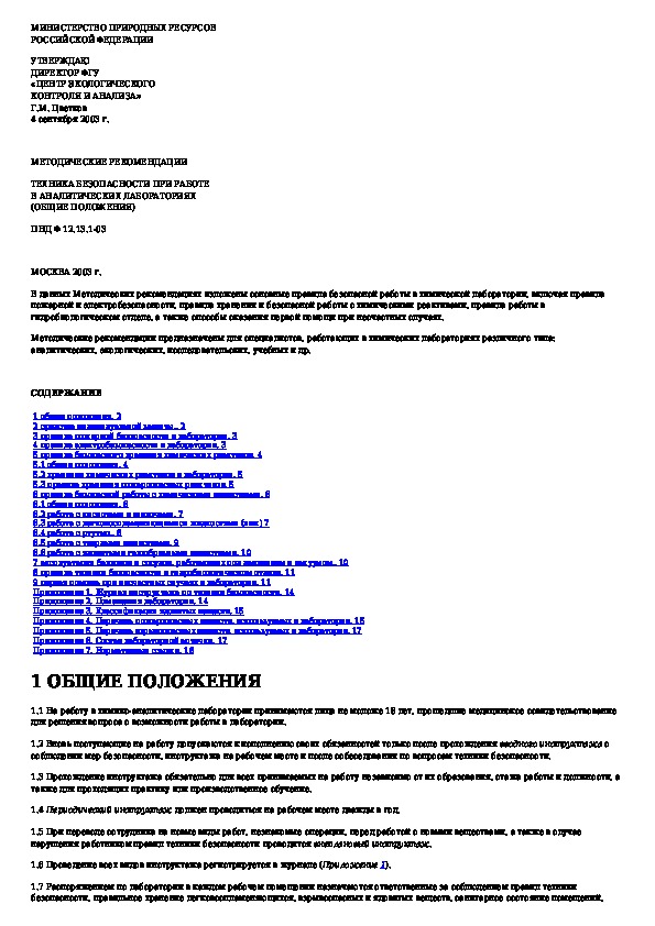 ПНД Ф 12.13.1-03: Методические рекомендации. Техника безопасности при работе в аналитических лабораториях (общие положения)