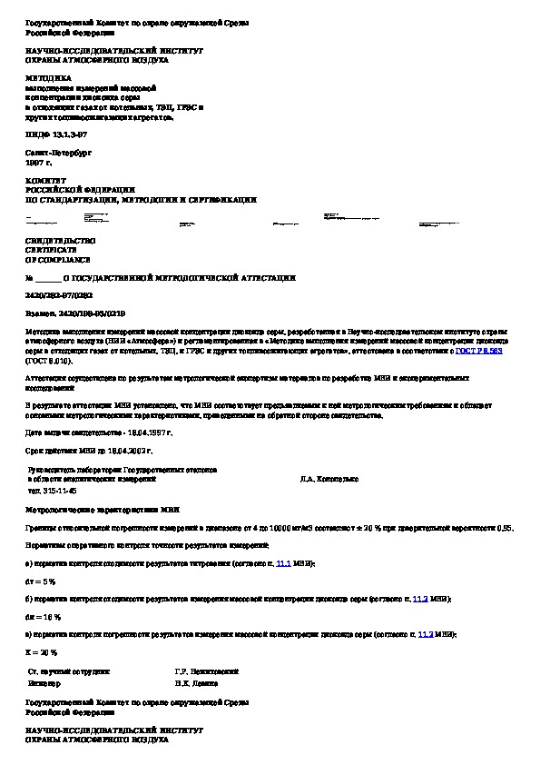 • Загрузка на компьютер - Вы можете также скачать Методика выполнения измерений массовой концентрации диоксида серы в отходящих газах от котельных, ТЭЦ, ГРЭС и других топливосжига на свой компьютер и сохранить его в файлах.