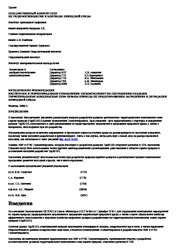 Методические рекомендации институтам и территориальным управлениям Госкомгидромета по составлению разделов территориальных ко
