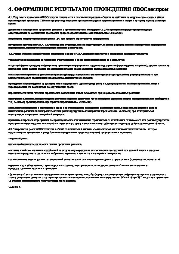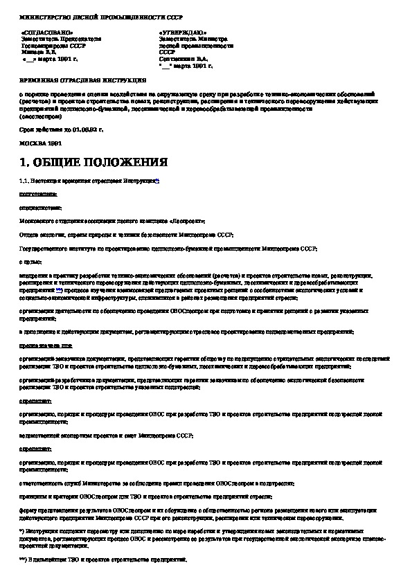 Временная отраслевая инструкция о порядке проведения оценки воздействия на окружающую среду при разработке технико-экономически