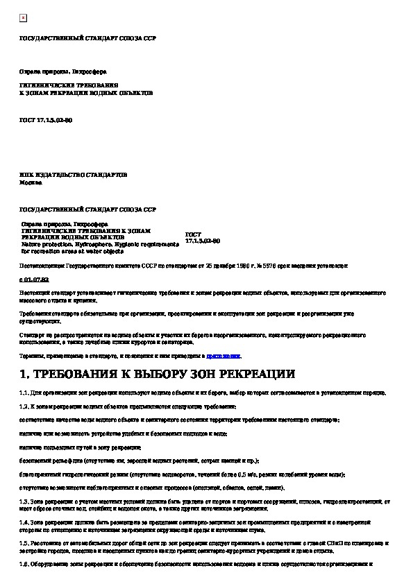 ГОСТ 17.1.5.02-80: Охрана природы. Гидросфера. Гигиенические требования к зонам рекреации водных объектов