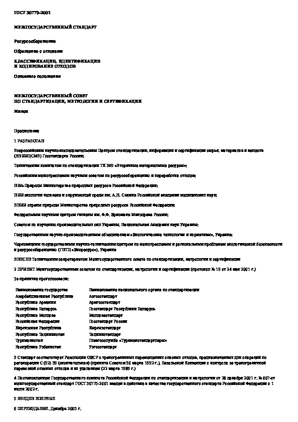 ГОСТ 30775-2001: Ресурсосбережение. Обращение с отходами. Классификация, идентификация и кодирование отходов. Основные положения