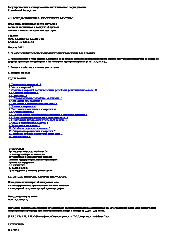 МУК 4.1.2813-10: Измерение концентраций ципроконазола в атмосферном воздухе населенных мест методом капиллярной газожидкостной хроматографии