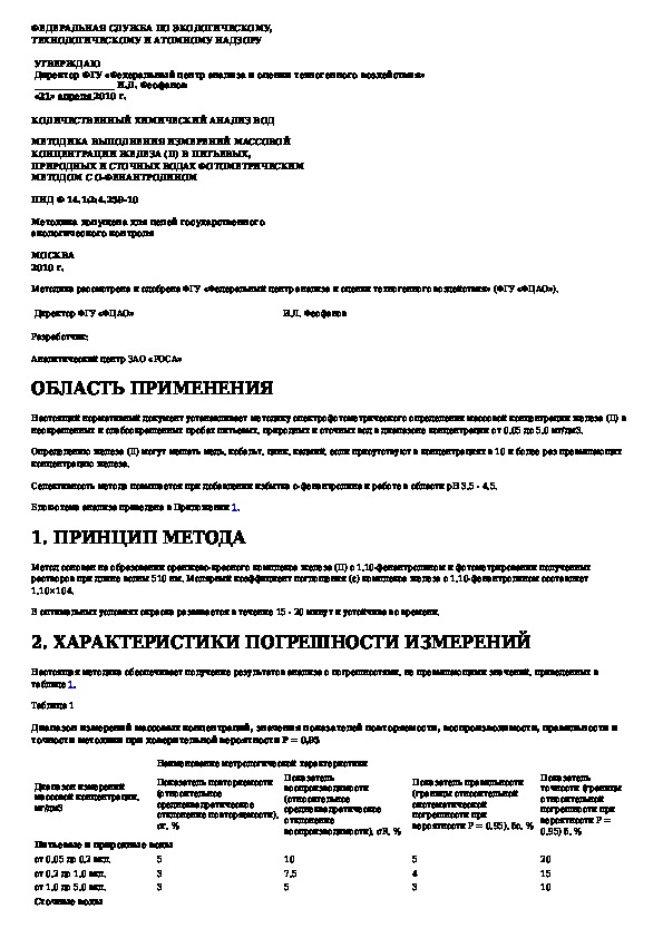 ПНД Ф 14.1:2:4.259-10: Количественный химический анализ вод. Методика выполнения измерений массовой концентрации железа (II) в питьевых, природных и сточ
