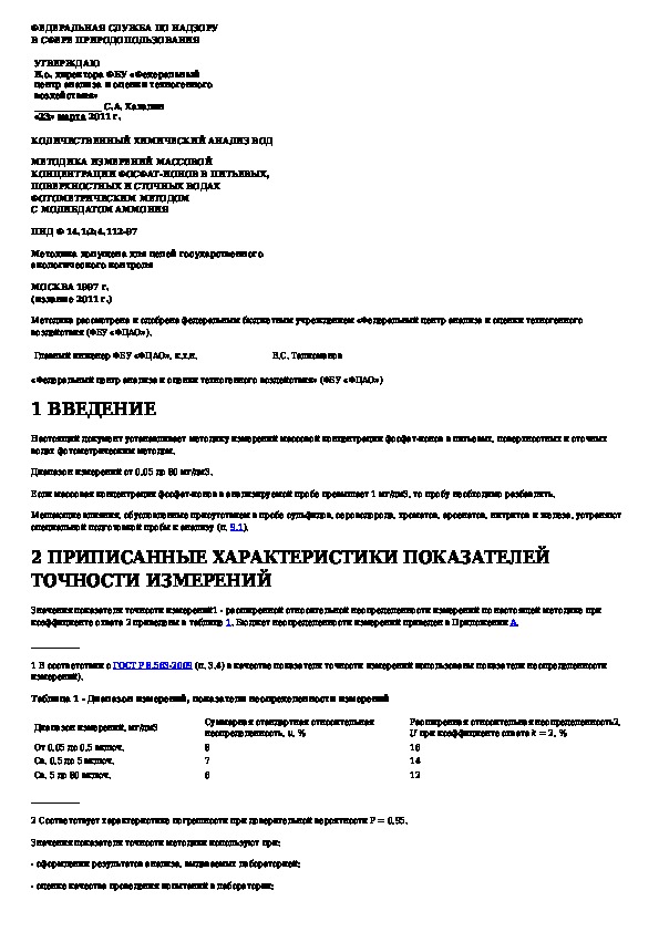 Наша цель состоит в том, чтобы предоставить вам быстрый доступ к содержанию документа Количественный химический анализ вод. Методика измерений массовой концентрации фосфат-ионов в питьевых, поверхностных и сточных .