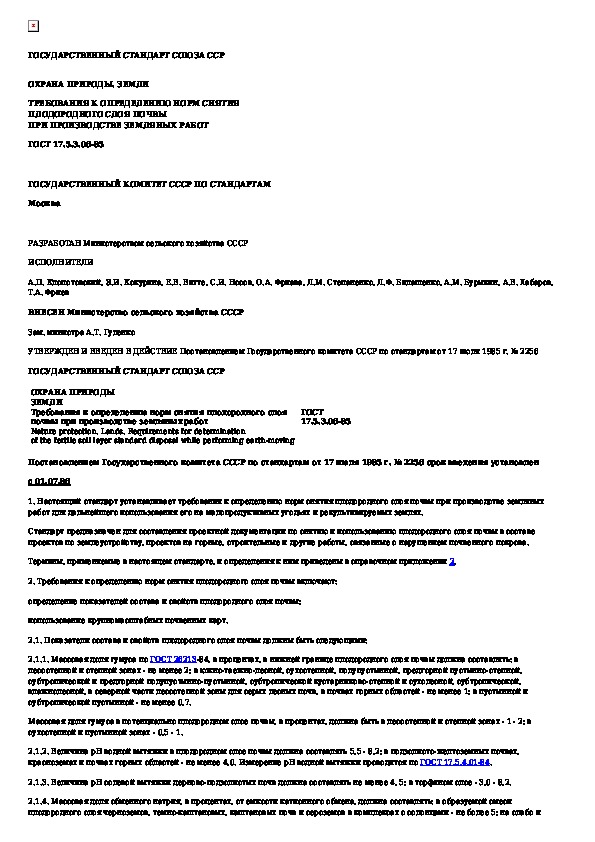 ГОСТ 17.5.3.06-85: Охрана природы. Земли. Требования к определению норм снятия плодородного слоя почвы при производстве земляных работ