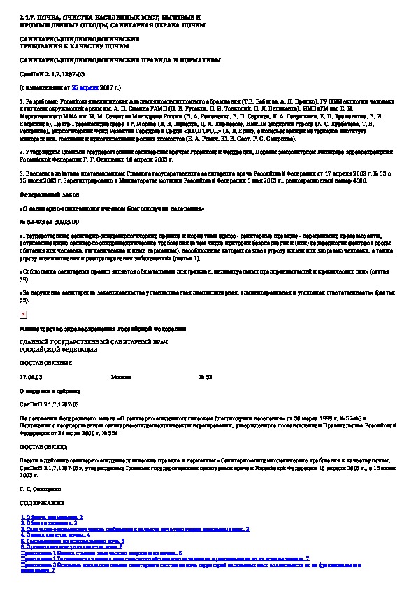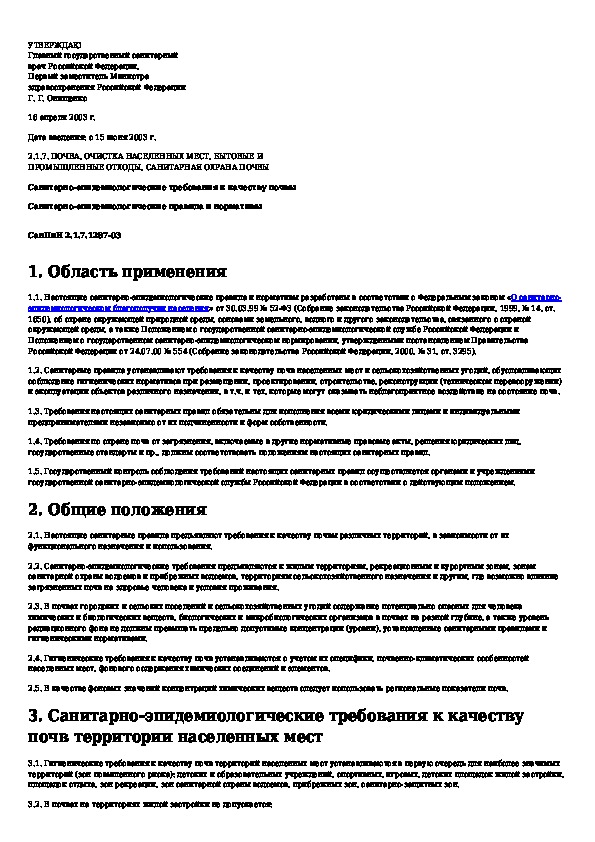 СанПиН 2.1.7.1287-03: Санитарно-эпидемиологические требования к качеству почвы
