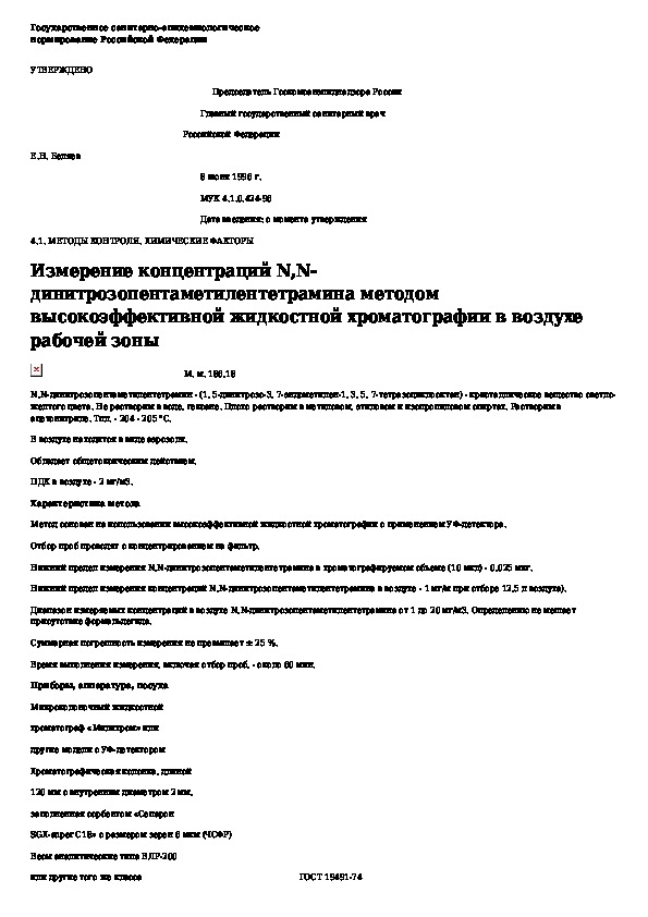 МУК 4.1.0.424-96: Измерение концентраций N, N-динитрозопентаметилентетрамина методом высокоэффективной жидкостной хроматографии в воздухе рабочей