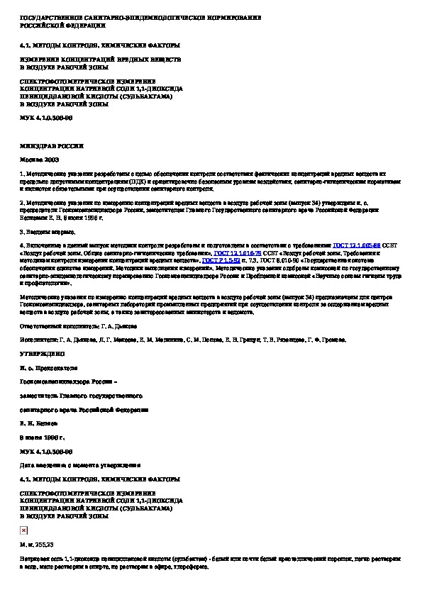 МУК 4.1.0.506-96: Спектрофотометрическое измерение концентрации натриевой соли 1,1-диоксида пенициллановой кислоты (сульбактама) в воздухе рабочей