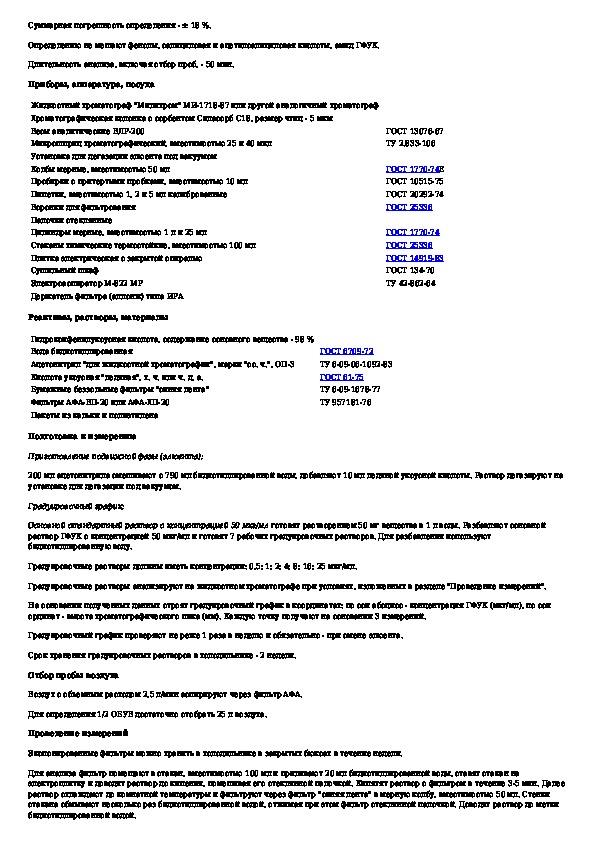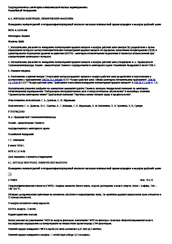 МУК 4.1.214-96: Измерение концентраций 4-гидроксифенилуксусной кислоты методом жидкостной хроматографии в воздухе рабочей зоны