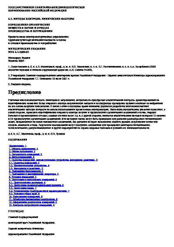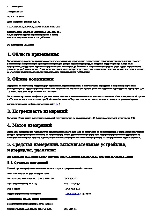 МУК 4.1.1062-01: Хромато-масс-спектрометрическое определение труднолетучих органических веществ в почве и отходах производства и потребления