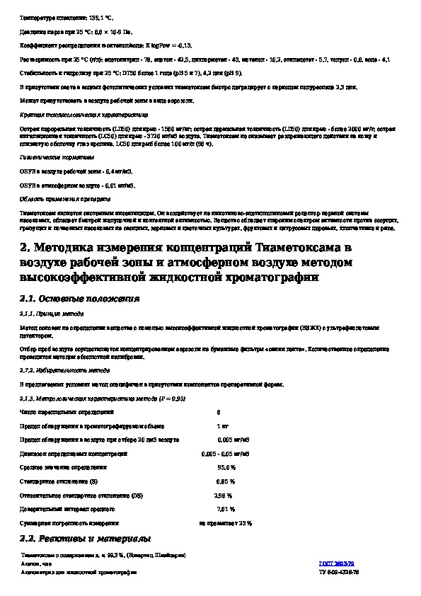 Измерение концентраций Тиаметоксама методом высокоэффективной жидкостной хроматографии в воздухе рабочей зоны и атмосферном во