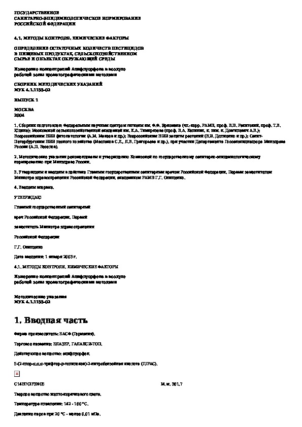 МУК 4.1.1155-02: Измерение концентраций Ацифлуорфена в воздухе рабочей зоны хроматографическими методами