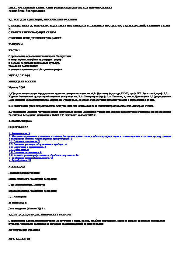 МУК 4.1.1427-03: Определение остаточных количеств Бенсултапа в воде, почве, клубнях картофеля, зерне и соломе зерновых колосовых культур, томатах и