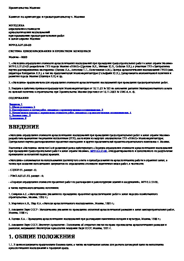 МРР 3.2.27.02-03: Методика определения стоимости археологических исследований при проведении градостроительных работ в зонах охраны Москвы