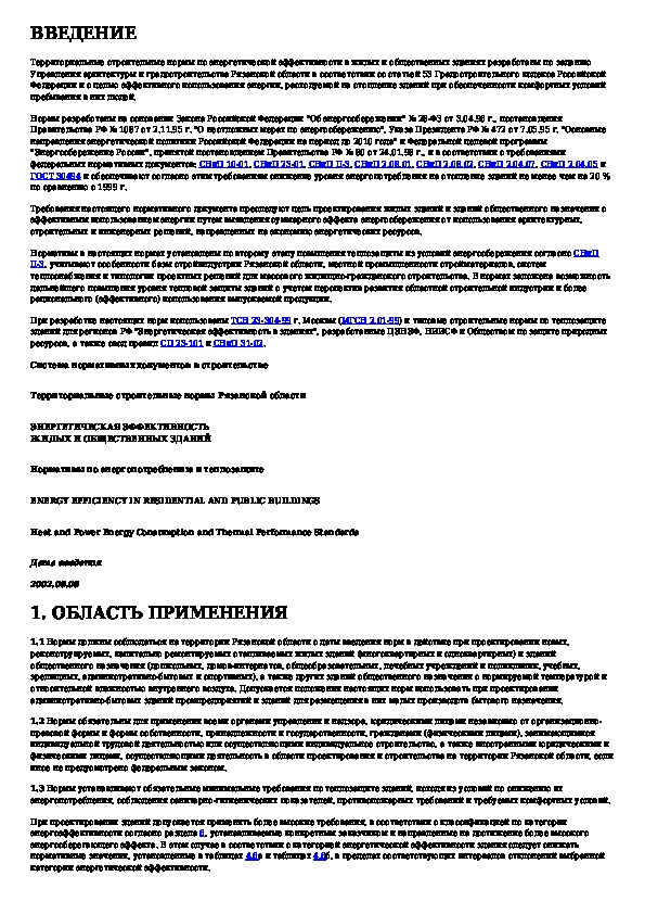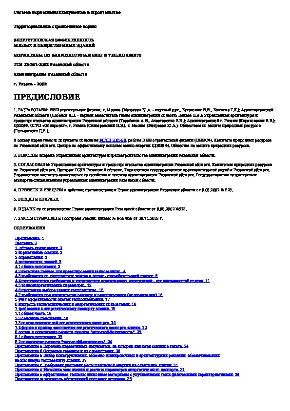 ТСН 23-341-2002: Энергетическая эффективность жилых и общественных зданий. Нормативы по энергопотреблению и теплозащите. Рязанская область