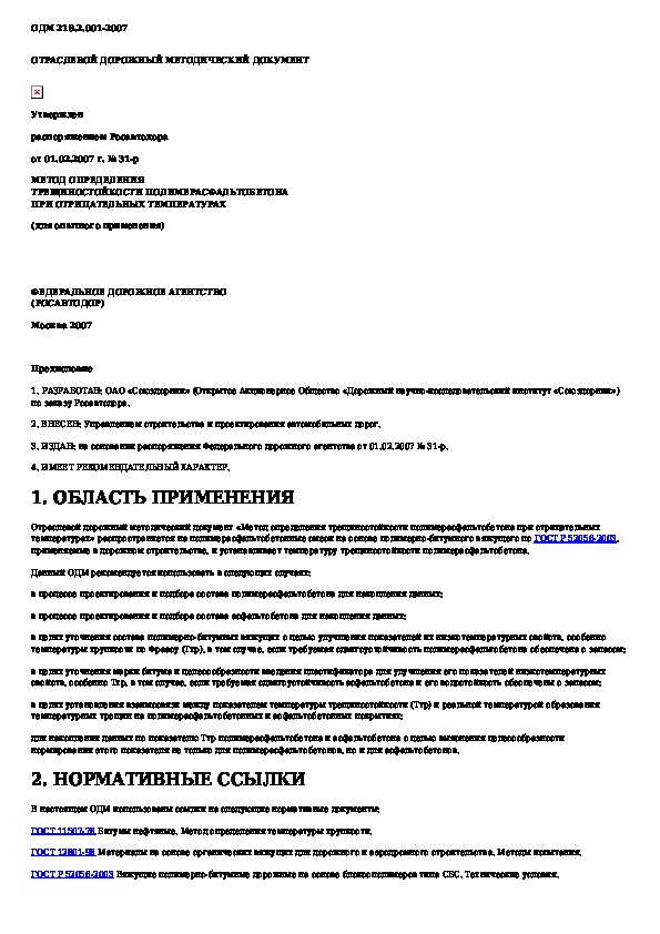 ОДМ 218.2.001-2007: Метод определения трещиностойкости полимерасфальтобетона при отрицательных температурах (для опытного применения)
