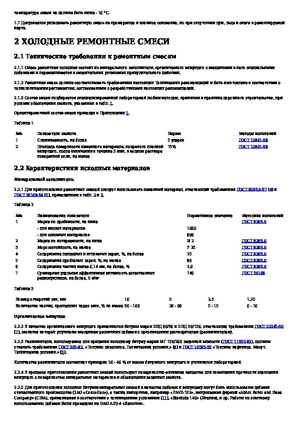 Технические рекомендации по составам и технологии ремонта дорожных одежд с применением холодных битумноминеральных смесей (холо