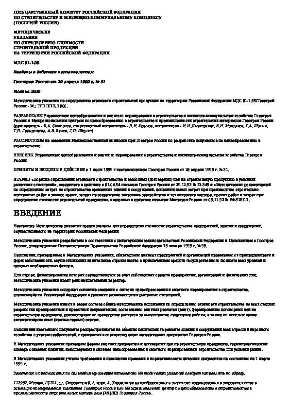 МДС 81-1.99: Методические указания по определению стоимости строительной продукции на территории Российской Федерации