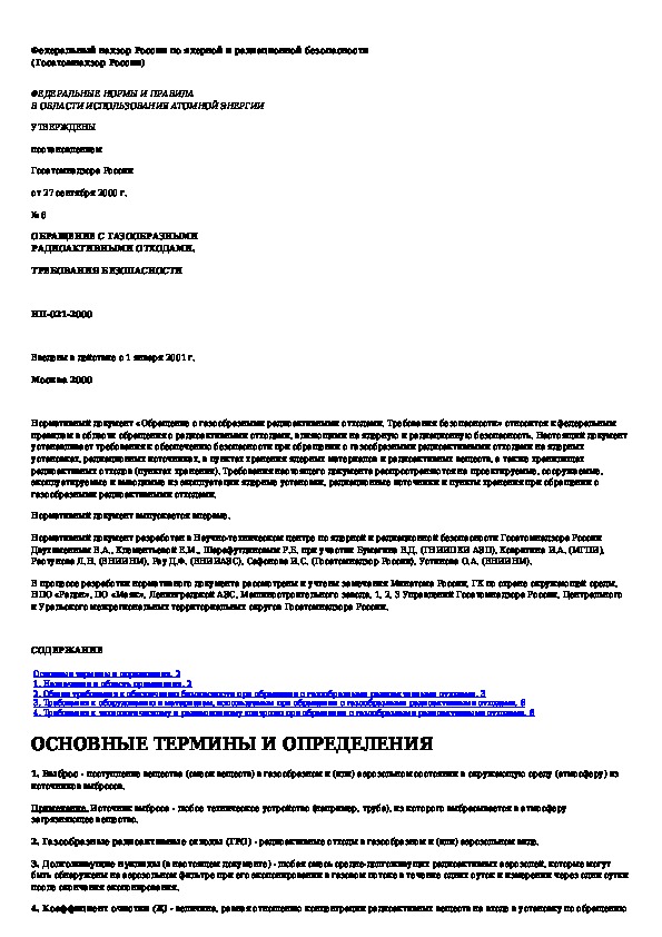 НП 021-2000: Обращение с газообразными радиоактивными отходами. Требования безопасности