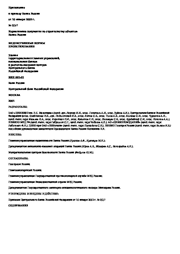 Наша цель состоит в том, чтобы предоставить вам быстрый доступ к содержанию документа Ведомственные нормы проектирования. Здания территориальных главных управлений, национальных банков и расчетно-кассовых центров .