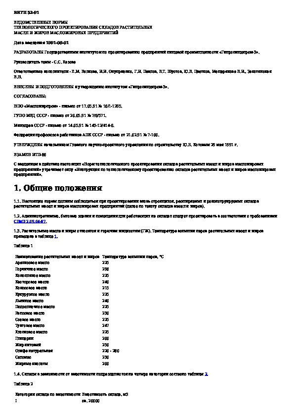ВНТП 52-91: Ведомственные нормы технологического проектирования складов растительных масел и жиров масложировых предприятий