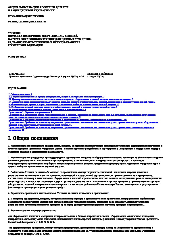 РД 03-36-2002: Условия поставки импортного оборудования, изделий и комплектующих для ядерных установок, радиационных источников и пунктов хране