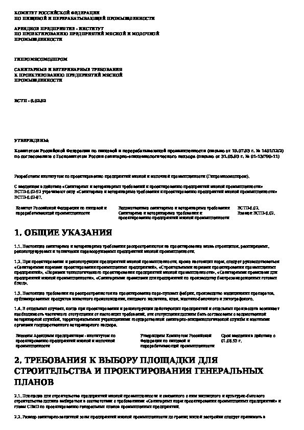 ВСТП 6.02-92: Санитарные и ветеринарные требования к проектированию предприятий мясной промышленности