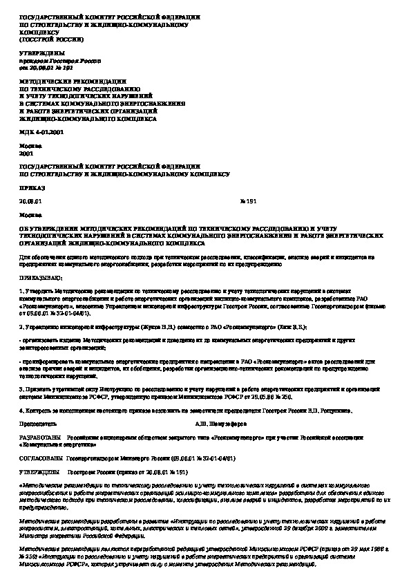 МДК 4-01.2001: Методические рекомендации по техническому расследованию и учету технологических нарушений в системах коммунального энергоснабж