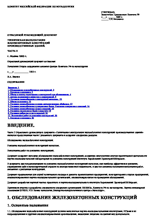 Наша цель состоит в том, чтобы предоставить вам быстрый доступ к содержанию документа Отраслевой руководящий документ. Техническая эксплуатация железобетонных конструкций производственных зданий. Часть II.